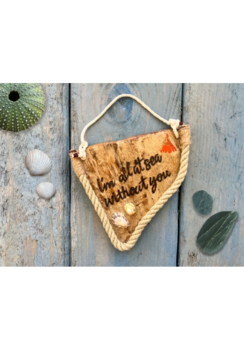 Pendant shaped hand crafted Cornish driftwood signs with the caption "I'm all at sea without you". Some of the pieces have been painted with a translucent wash of exterior blue emulsion and others have a been treated with exterior varnish. The signs comes complete with a 10mm nautical rope surround, finished at both ends with whipping and brass eyelet hangers with a macramé rope tied at both ends with fisherman's knots and some feature a minature safety lifebuoy ring. Some of the larger versions have craft rope attached to the top.
