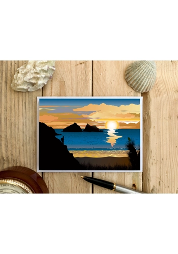 A landscape orientated A5 (210mm x 148mm) greetings card featuring a full colour illustration of the famous Holywell Bay which provides breathtaking spectacle both above and under the cliffs. The South West Coast Path travels across to the sheer cliffs giving panoramic ocean views of Penhale Point and Kelsey Head. Underneath the cliffs on the north end is St. Cuthbert's Cave, accessible only at low tide. Take a torch inside and explore the cave's bizarre and colourful mineral formations, though ensure you leave long before the tide comes in.