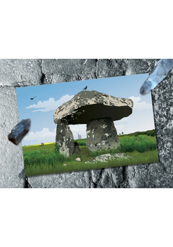 A beautiful full colour illustration from The Cornish Collection of Lanyon Quoit which is a dolmen in West Cornwall, England, two miles southeast of Morvah. It collapsed in a storm in 1815 and was re-erected nine years later and as a result the dolmen is now very different from its original appearance. The illustration is a landscape orientated A5 (210mm x 148mm) 300gsm greeting card, left blank inside for your own personal message. The design features a reproduction of an original waltercolour of beach stones on the inside, taken from nearby Church Cove, Gunwalloe and comes packaged in a clear poly bag and a plain white envelope. I painted this scene in watercolours but decided a vector illustration was better suited for reproduction on to high quality silk stock card.Lanyon Quoit currently has three support stones which stand to a height of 1.5 metres. These bear a capstone which is 5.5 metres long and which weighs more than 12 tonnes.
