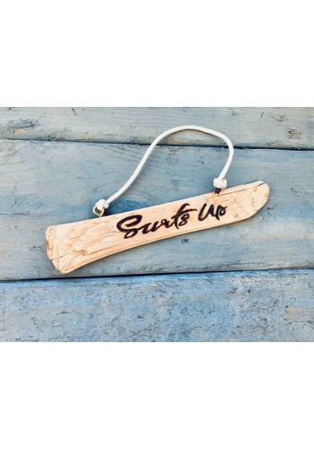 A hand crafted Cornish driftwood sign with the caption "Surf's Up!" in the shape of a surf board. The sign has been pyrographed at a high temperature to burn the hand drawn lettering on to the driftwwod. The phrase "Surf's Up!" is a slang term popular with surfers meaning the waves are ideal for surfing. For instance; "Hey man, grab your board! Surf's up!"
