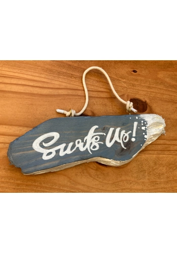 A hand crafted Cornish driftwood sign with the caption "Surf's Up", which is a traditional and popular slang term popular with surfers meaning the waves are ideal for surfing. For instance; "Hey man, grab your board! Surf's up!". It can also be used by extension to indicate humorously that something is ready to begin. "Come on, Jerry, the car is packed and we're ready to go. Surf's up, dude!"