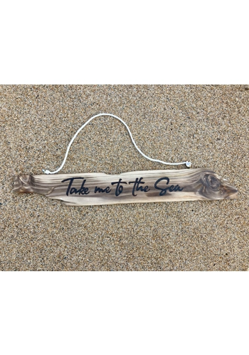 Various hand crafted Cornish driftwood signs with the caption "Take me to the sea" and from locally sourced driftwwod washed up on the shoreline at various beaches and harbours in South West Cornwall. The sign itself has been pyrographed at a high temperature to burn the hand drawn lettering on to the timber.